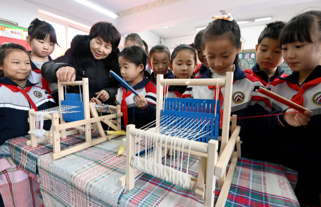河北省邯郸市土布织染技艺传承人贺玉秀指导学生们利用织布机模型学习织布技艺。通讯员 郝群英 摄